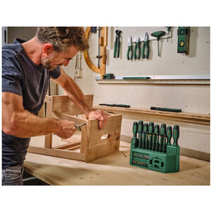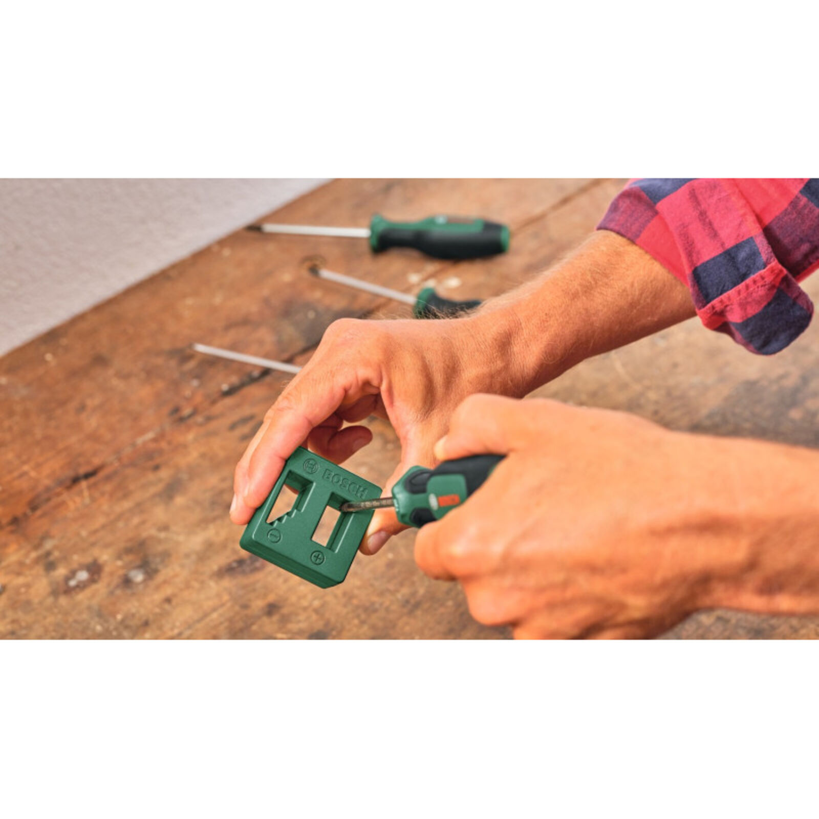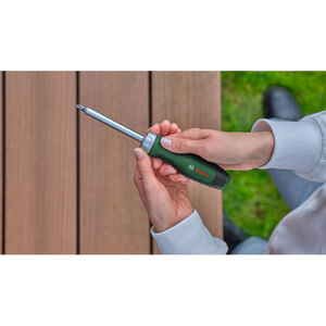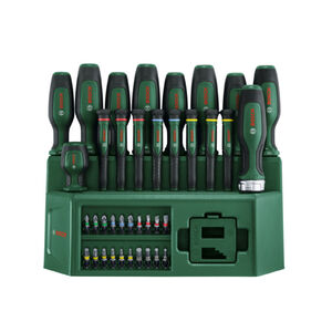 39 részes készlet többféle kiváló minőségű csavarhúzóval és praktikus rekesszelMinőségi, robusztus anyagokból, szakértelemmel kialakítva a hosszú élettartamértKényelmes használat és irányítás a kiváló ergonómiának és a lágymarkolatú fogantyúknak köszönhetőenSzínkódolás a megfelelő csavarhúzó és bittípus egyszerűbb és gyorsabb kiválasztása érdekébenTartalma: 8 hagyományos csavarhúzó, 8 precíziós csavarhúzó, 1 bittartós racsnis csavarhúzó, 1 bittartós marokcsavarhúzó, 1 mágnesező és 20 bitRobusztus rekesz a rendezett tároláshoz és könnyű hozzáféréshezTöbbféle kiváló minőségű csavarhúzó a rögzítési munkák hatékony elvégzéséhez barkácsoláskorBármilyen rögzítési feladat gyors és hatékony elvégzése a Bosch kiváló minőségű 39 részes, vegyes csavarhúzókészletével. A készlet számos különböző csavarhúzót tartalmaz: 8 hagyományos csavarhúzó (PH1/2, PZ1/2, SL4/6.5, TX20/25), 8 precíziós csavarhúzó (SL1.5/2.5/3, PH00/PH0, TX5/6/8), 1 bittartós racsnis csavarhúzó, 1 bittartós marokcsavarhúzó és 20 bit (PH1/2/3, PZ1/2/3, SL3/4/5/6, TX10/15/20/25/30,40, HEX3/4/5/6). Mindegyik csavarhúzó tartós anyagokból készült. Kétkomponensű, lágymarkolatú nyéllel rendelkeznek a maximális kényelem érdekében. A színkódolt típusjelzéseknek köszönhetően a csavarhúzók és a bitek kiválasztása könnyebb és gyorsabb. A készlet tartalmaz egy mágnesezőt is a csavarhúzók hegyeinek és bitjeinek egyszerű (le)mágnesezéséhez. A munkapadra helyezhető, praktikus rekesz rendezett tárolást és könnyű hozzáférést biztosít. Tartalom:8 x csavarhúzó (PH1/2, PZ 1/2, SL4/6.5, TX20/25)8 x műszerész csavarhúzó (SL1.5/2.5/3, PH00/0, TX5/6/8)1 x bittartós racsnis csavarhúzó (1 600 A02 Z99) 1 x bittartós marokcsavarhúzó (1 600 A03 EC2)1 x mágnesező (1 600 A03 3BN)20x bitfej (PH1/2/3, PZ1/2/3, SL3/4/5/6, TX10/15/20/25/30/40, HEX3/4/5/6)1 x rekesz