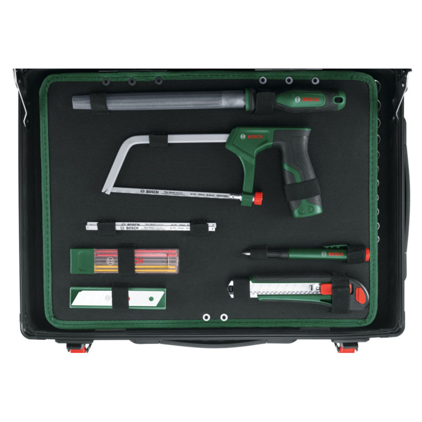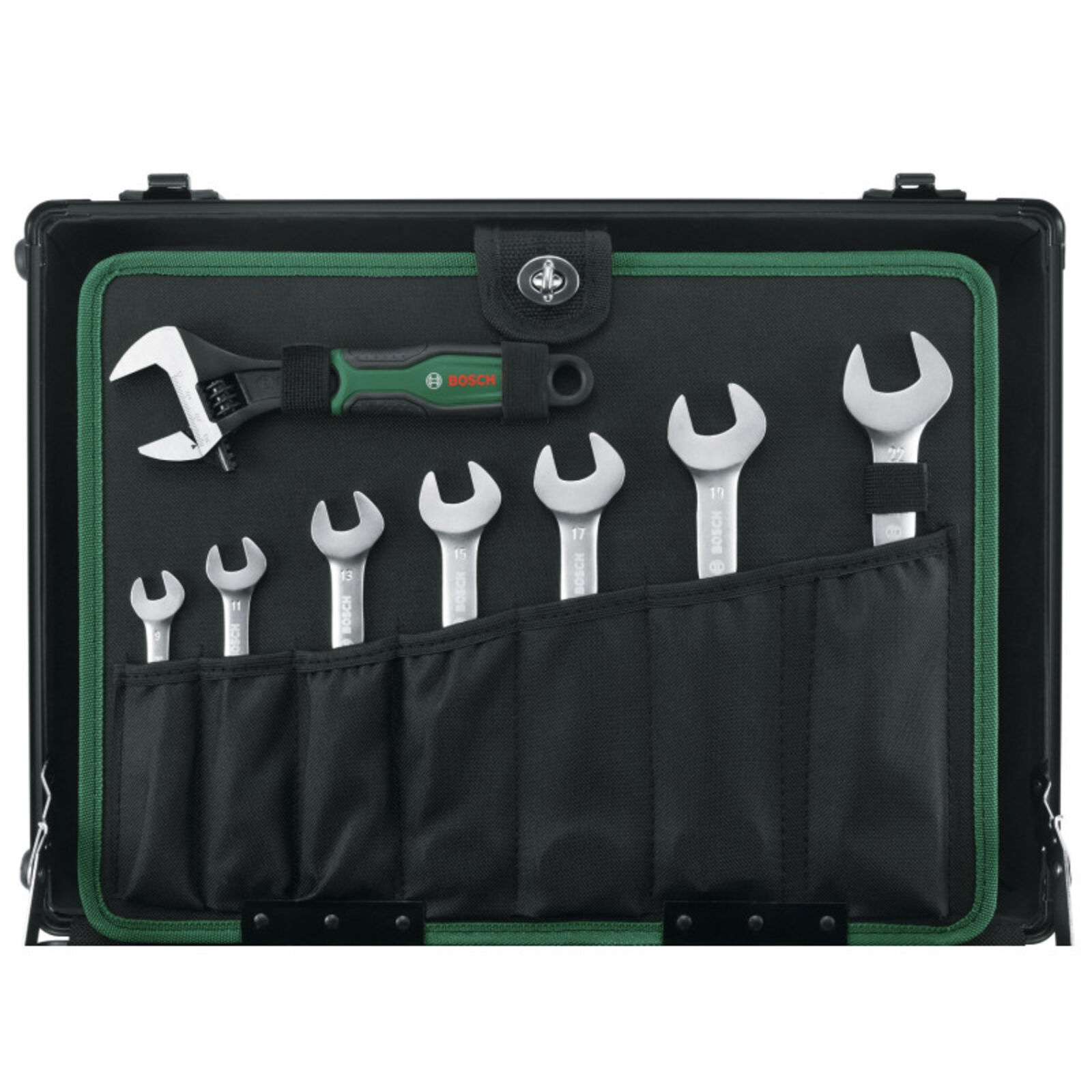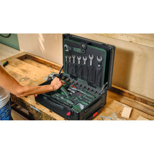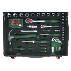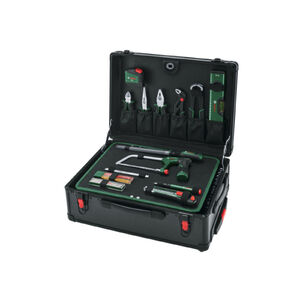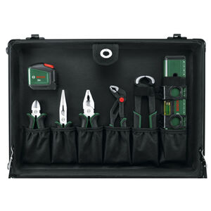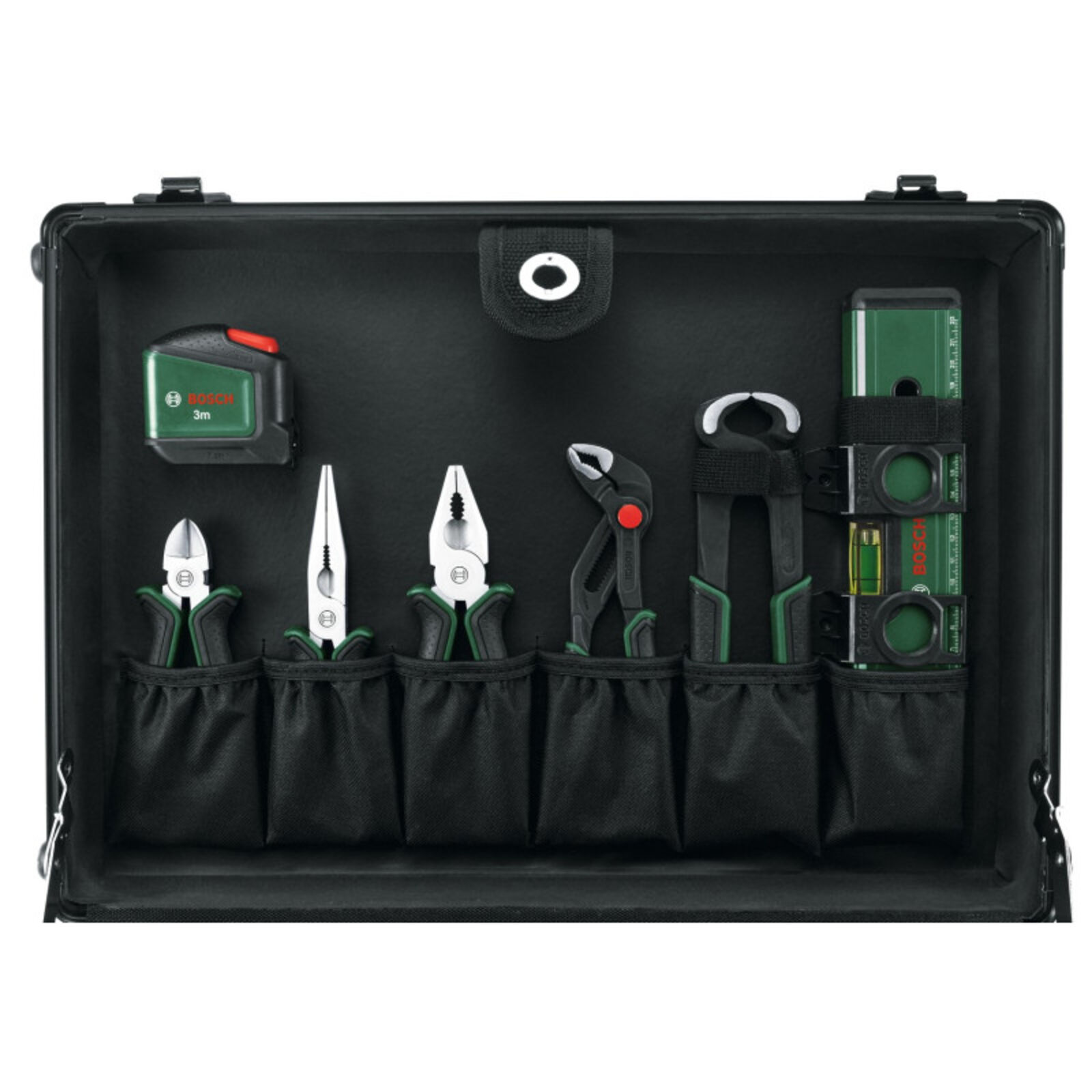 Kiváló minőségű, minden az egyben szerszámkészlet egyetlen kocsiban119 részes készlet többek között fogóval, bittartós csavarhúzókkal, tapétavágóval, kalapáccsal és darabolófűrésszelKiváló minőségű anyagokból a tartósság érdekébenOptimális ergonómia a fokozott irányíthatóság és kényelem érdekébenGörgős szerszámtáska teleszkópos fogantyúval a könnyű szállításhoz és tároláshozPraktikus tárolórendszer a kéziszerszámok rendszerezéséhezA csomagban térdvédő is található a kényelmesebb munkavégzéshezHosszú élettartamú, minden az egyben szerszámkészlet a megbízható teljesítményért bármilyen barkácsolási feladat soránA Bosch 114 részes görgős szerszámtáskájában a barkácsolási feladatokhoz szükséges összes kéziszerszám megtalálható. Tartós kéziszerszámok széles választéka – fogók, racsnis szerszámok, csavarhúzók, csavarkulcsok, darabolófűrész, kalapács, mérőszalag és sok más. Minden szerszám tartós anyagokból készült, valamint ergonomikus kialakítással és lágymarkolatú nyéllel rendelkezik. A szerszámok kiváló minőségű görgős tokban találhatók, amely rendezett tárolást és védelmet biztosít. A teleszkópos, kihúzható fogantyú és a két praktikus oldalsó fogantyú megkönnyíti a táska hordozását. A praktikus tárolórendszernek köszönhetően a szerszámok rendezetten tárolhatók és könnyen hozzáférhetők. A beépített térdvédő kényelmes munkavégzést biztosít a talajon is.Tartalom:1 x 180 mm-es kombinált fogó (1 600 A03 2VB)1 x csőrös fogó, 180 mm (1 600 A03 2VC)1 x diagonális csípőfogó, 160 mm (1 600 A03 2VE)1 x harapófogó, 200 mm (1 600 A02 Z9W)1 x csőfogó, 180 mm (1 600 A03 9HU)1 x mérőszalag, 3 m (1 600 A03 2UX)1 x 25 cm-es vízmérték jelölőcsúszkákkal (1 600 A02 7PL)1 x szeghúzó kalapács, 340 g / 12 oz (1 600 A02 W7X)1 x puha ütköző1 x fémfűrész, 150 mm (1 600 A02 ZA7)1 x félkör alakú fémreszelő, 200 mm / 8" (1 600 A03 DR8)1 x bittartós racsnis csavarhúzó (1 600 A02 Z99) 1 x bittartós marokcsavarhúzó (1 600 A03 EC2)3 x műszerész csavarhúzó (SL2.5/PH0/TX8)1 x állítható csavarkulcs, 150 mm / 6" (1 600 A03 9HN)1 x letörhető kés, 18 mm, 3 pengével (1 600 A03 2V8)10 x letörhető penge, SK5 acél (1 600 A03 2US)1 x mélylyuk-jelölő ceruza (1 600 A03 2V2)6 x többszínű ceruzabél (1 600 A03 2UV)10 x hatszögkulcs (1,5, 2, 2,5, 3, 4, 5, 5,5, 6, 8, 10 mm)7 x dupla villáskulcs (8/9, 10/11, 12/13, 14/15, 16/17, 18/19, 20/22)1 x 1/2"-os racsni (1 600 A03 17V)10x 1/2" behajtófej (14, 15, 16, 17, 18, 19, 20, 21, 22, 24 mm)1 x univerzális csatlakozóadapter 1/2”-os hajtószárhoz1 x 1/2"-os meghajtó toldószár, 125 mm1 x 1/4"-os racsni10x 1/4" behajtófej (5, 5,5, 6, 7, 8, 9, 10, 11, 12, 13 mm)1 x 1/4"-os meghajtó toldószár, 50 mm1 x 1/4"-os behajtófej univerzális csatlakozóadapter32 x bitfej, 25 mm1 x dugókulcs markolat1 x gurulós szerszámtáska