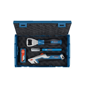 3 szerszámból álló limitált készlet: 1 univerzális kihajtható szőnyegkés, 1 jelölőtoll és 1 palacknyitóA 13 Bosch Professional cserekés kompatibilis az összes Bosch Professional szabványos univerzális késselA palacknyitó kizárólag ebben a készletben kapható