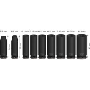Erőteljes csavarozás Króm-molibdén acél a nagy nyomatéknak való ellenállás érdekében A foszfátbevonat megvédi a foglalatot a rozsdától és a korróziótól A készlet tartalma: Kulcsnyílás: 7 mm; hosszúság: 60 mm Kulcsnyílás: 8 mm; hosszúság: 62 mm Kulcsnyílás: 10 mm; hosszúság: 63 mm Kulcsnyílás: 12 mm; hosszúság: 63 mm Kulcsnyílás: 13 mm; hosszúság: 63 mm Kulcsnyílás: 15 mm; hosszúság: 63 mm Kulcsnyílás: 16 mm; hosszúság: 63 mm Kulcsnyílás: 17 mm; hosszúság: 63 mm Kulcsnyílás: 19 mm; hosszúság: 63 mm