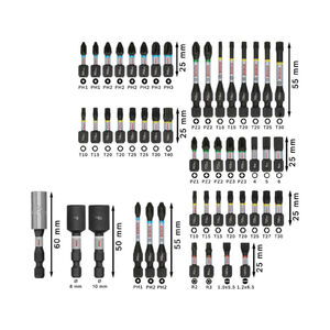 A készlet tartalma:25 mm-es csavarbit:PH1 (2 db); PH2 (4 db); PH3 (2 db)PZ1; PZ2 (2 db); PZ3 (2 db)T10 (2 db); T15 (3 db); T20 (4 db); T25 (3 db); T27; T30 (2 db); T40H4; H5; H6SL5,5; SL6,5R2; R355 mm-es csavarbit:PH1; PH2 (2 db)PZ2 (2 db)T10; T15; T20 (2 db); T25; T3050 mm-es dugókulcs:8 mm; 10 mm60 mm-es bittartó