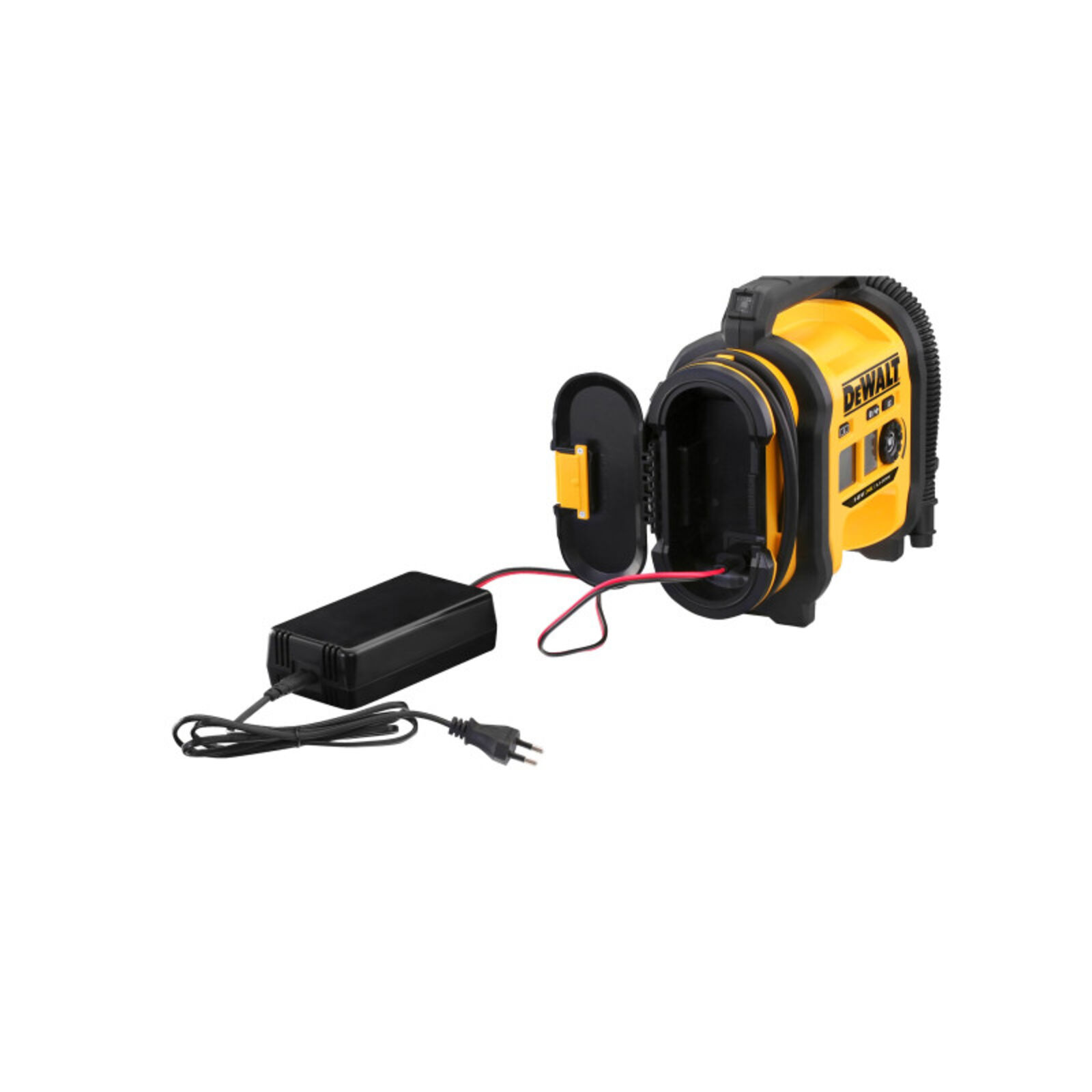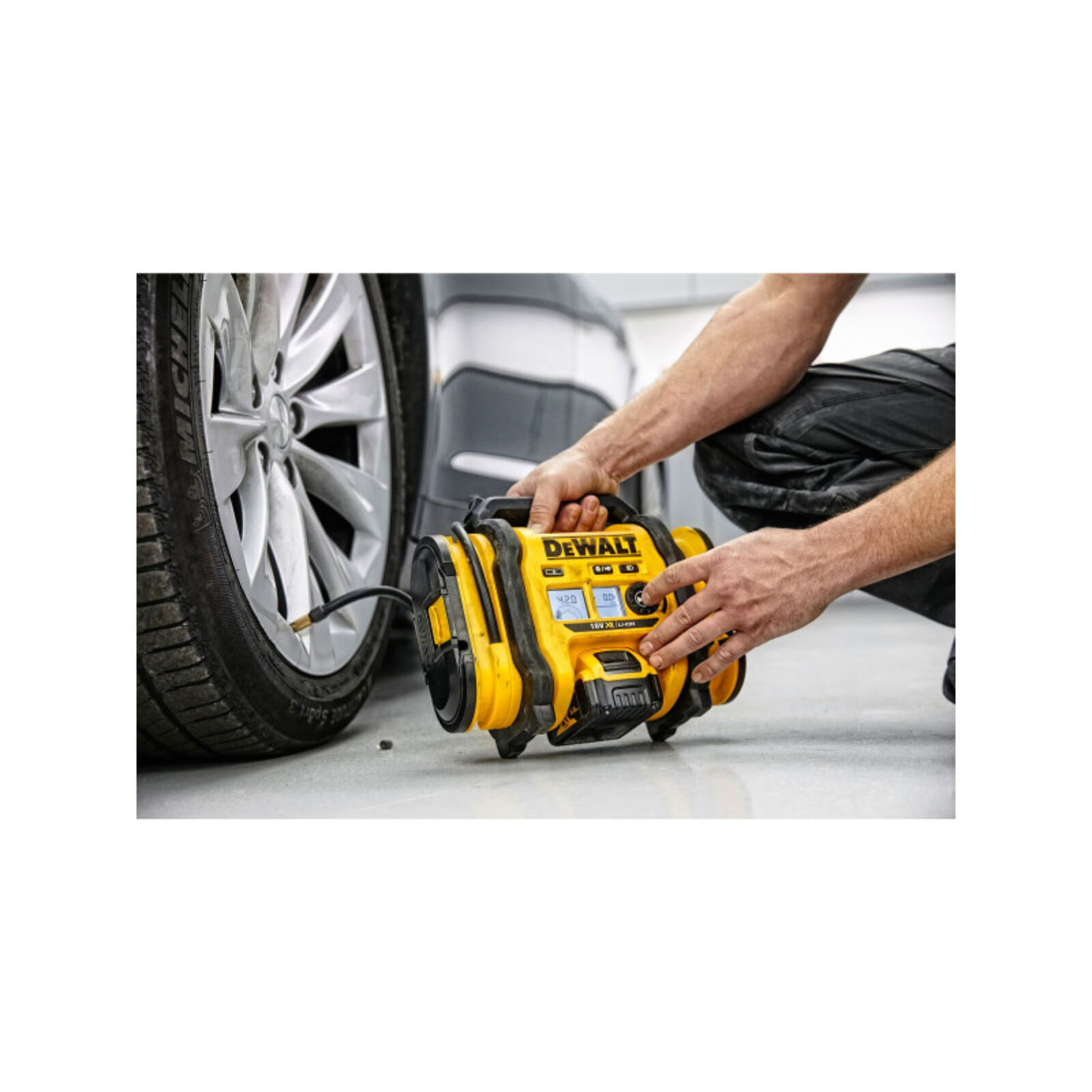 2 két kiváló minőségű LCD kijelző a paraméterek egyszerű beállításához, LED dióda asztali világításhoz, tápellátás három különböző forrásból 18 V DeWALT akkumulátor, 12 V autó akkumulátor vagy 230 V (230 V hálózati adapter nem tartozék) átkapcsolása nélkül. A nagynyomású kimenet 400 másodperc alatt felfújja a 235/70R17 gumiabroncsot. Egy 4,0 Ah 18 V-os akkumulátorral 6 ilyen gumi- abroncsot fúj fel. Nagy térfogatú kimenet tömlővel és fúvókával a különböző tárgyak gyors felfújásához és leeresztéséhez Különböző egységek egyszerű beállítása (BAR, kPa, PSI). Automatikus kikapcsolás a beállított nyomás elérésekor. Beépített tároló gumiabroncs-felfújó adapterek, ballon-tű és 12 V-os autós hálózati adapter számára. A 230 V-os hálózati adapter csak pótalkatrészként kapható N557515 cikkszámmal Technikai adatok Akkumulátor típusa Li-Ion Akkumulátorral együtt 0 Akkumulátor kapacitás (Ah) Akkumulátor nélkül szállítva Max. nyomás (Bar/PSI) 11 / 160 Levegő mennyisége (l/perc) 12,7 Tömlőhossz nagy nyomás (m) 0,65 Tömlőhossz nagy térfogat (m) 0,45 Töltő típusa Töltő nélkül szállítva Súly akkumulátor nélkül (kg) 3,1