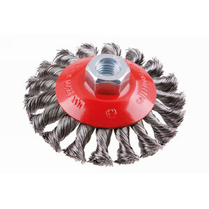 Rotary brush - cup, design: COPY - patented wire 0.5 mm - copy, do not unravel even under extreme load, diameter 100 mm, thread M14x2 mm, number of wires: 900, wire length: 23 mm, max. permissible revolutions: 12500 1 /min, use: removal of paint, rust, burrs, welding residues, slag, roughening, cleaning of metal parts, packaging paper box with euro hole.
