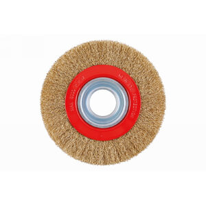Rotary brush - circular, design: corrugated wire, FESTA brushes guarantee quality used materials and processing, wire 0.3 mm - brass-plated, diameter 150 mm, mounting hole 32 mm (including reduction rings 12.7 mm - 1/2, 15.8 mm - 5/8, 19 mm - 3/4, 22.2 mm and 25.4 mm - 1), number of wires 7200, wire length 30 mm, maximum revolutions per min. 6000, suitable for locksmith and metalworking work, removing rust, paint, polishing..., packaging: paper box.