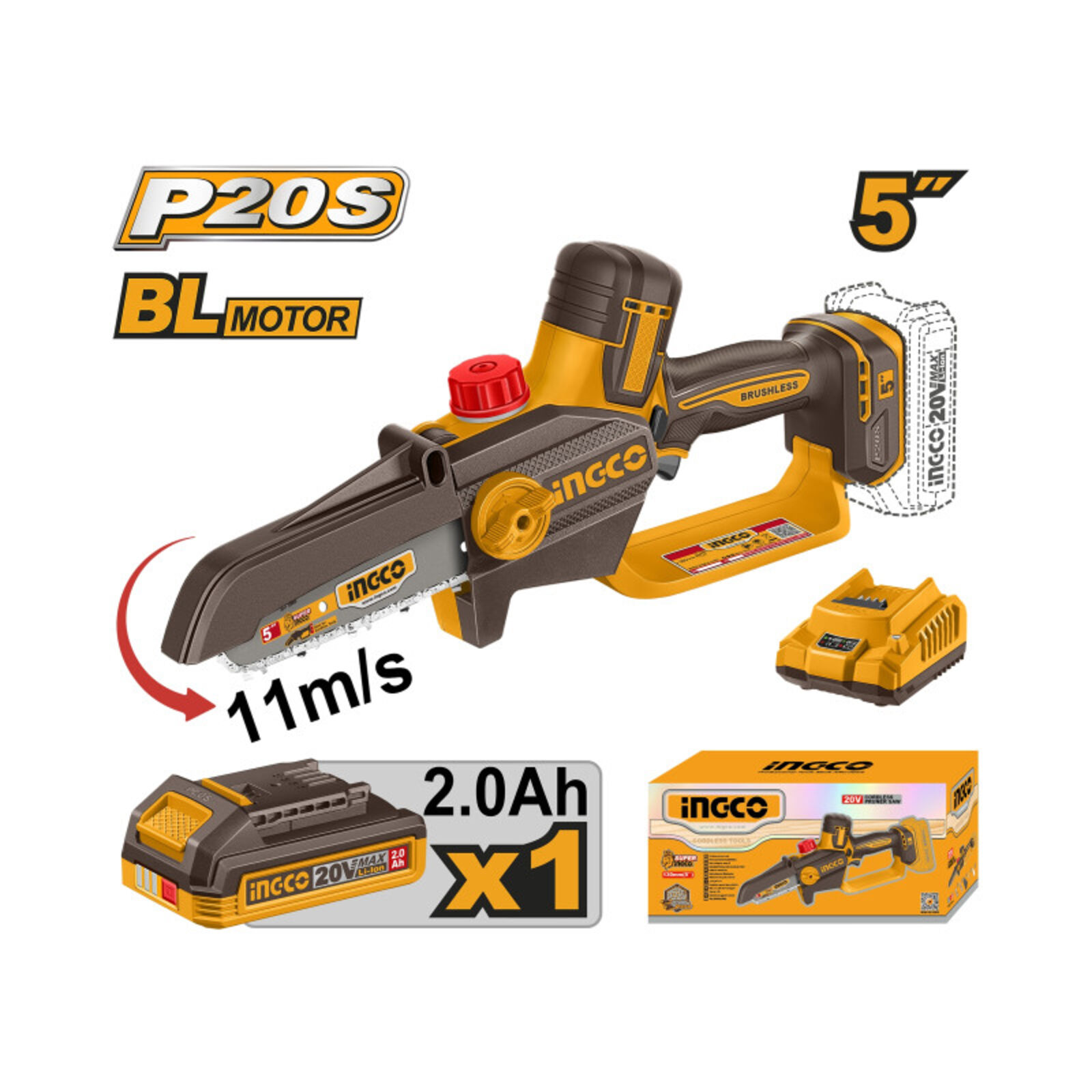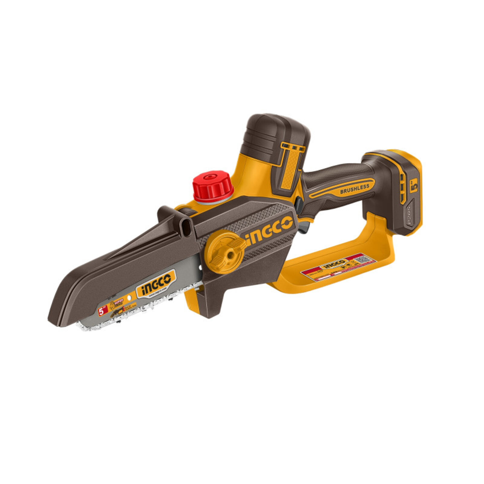 INGCO Akkus láncfűrész 127 mm szénkefe nélküli 20 V (1 x 2,0 Ah akku + töltő)