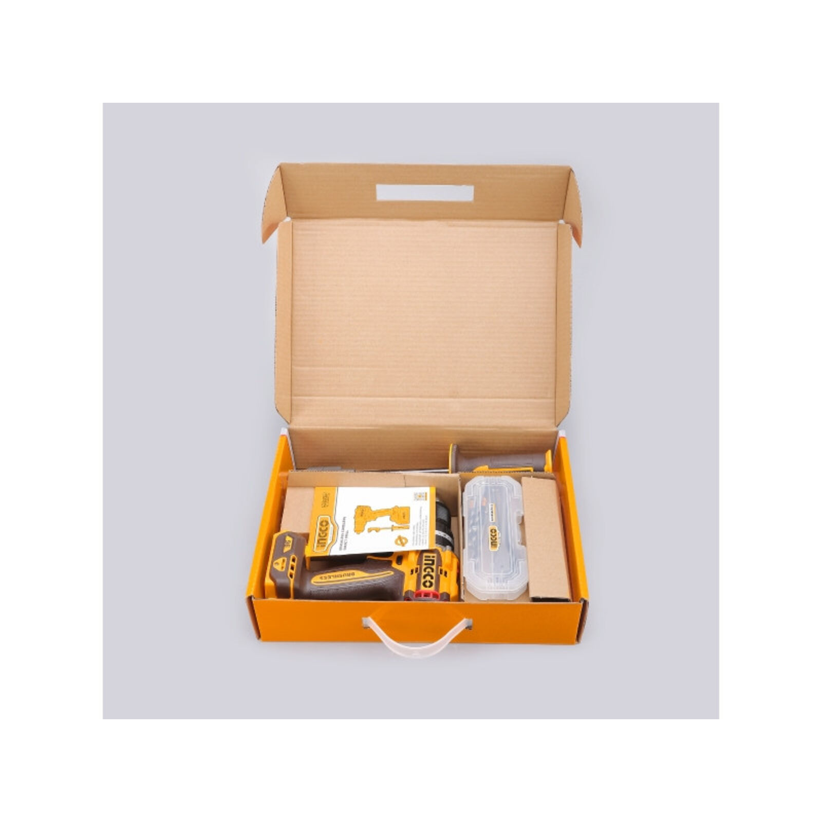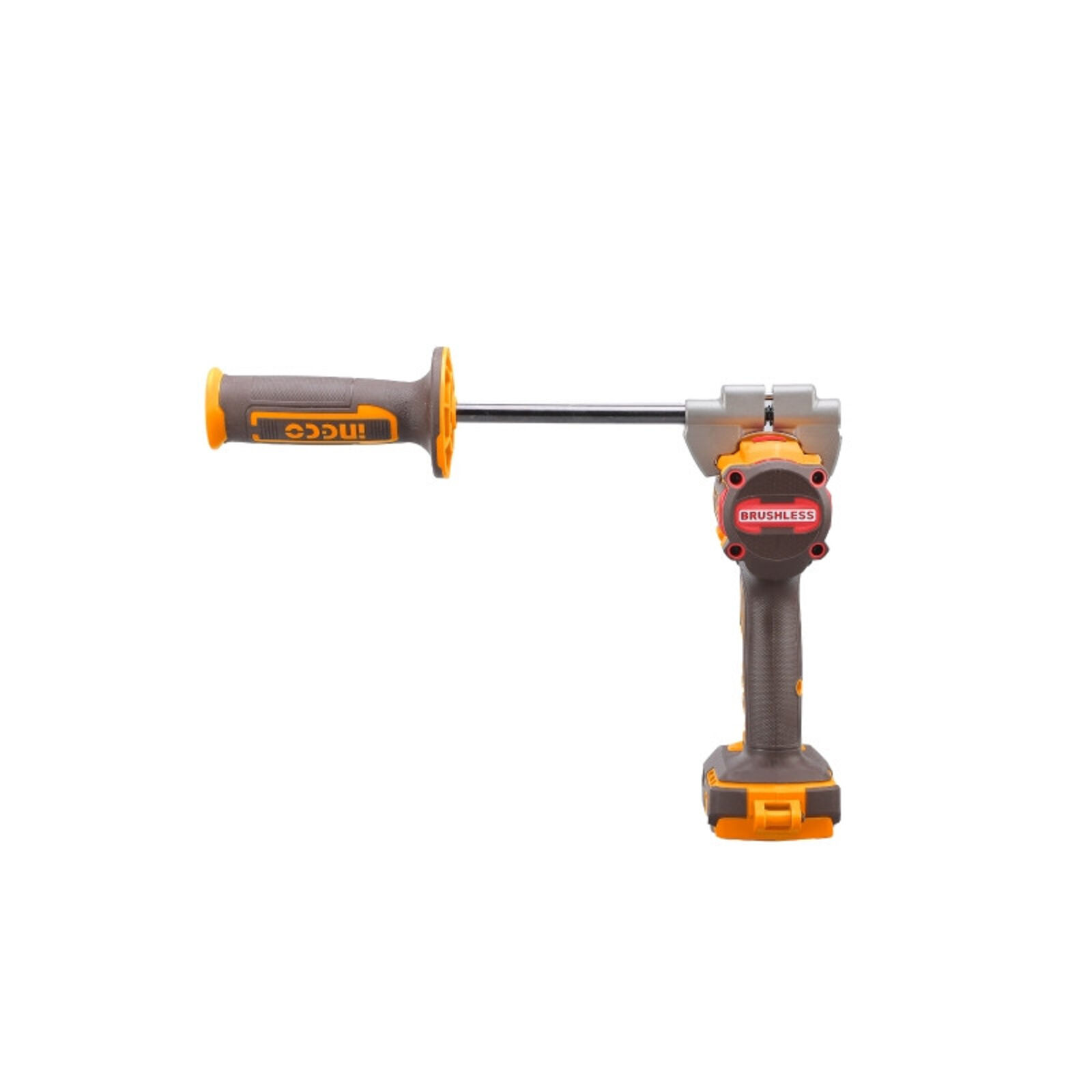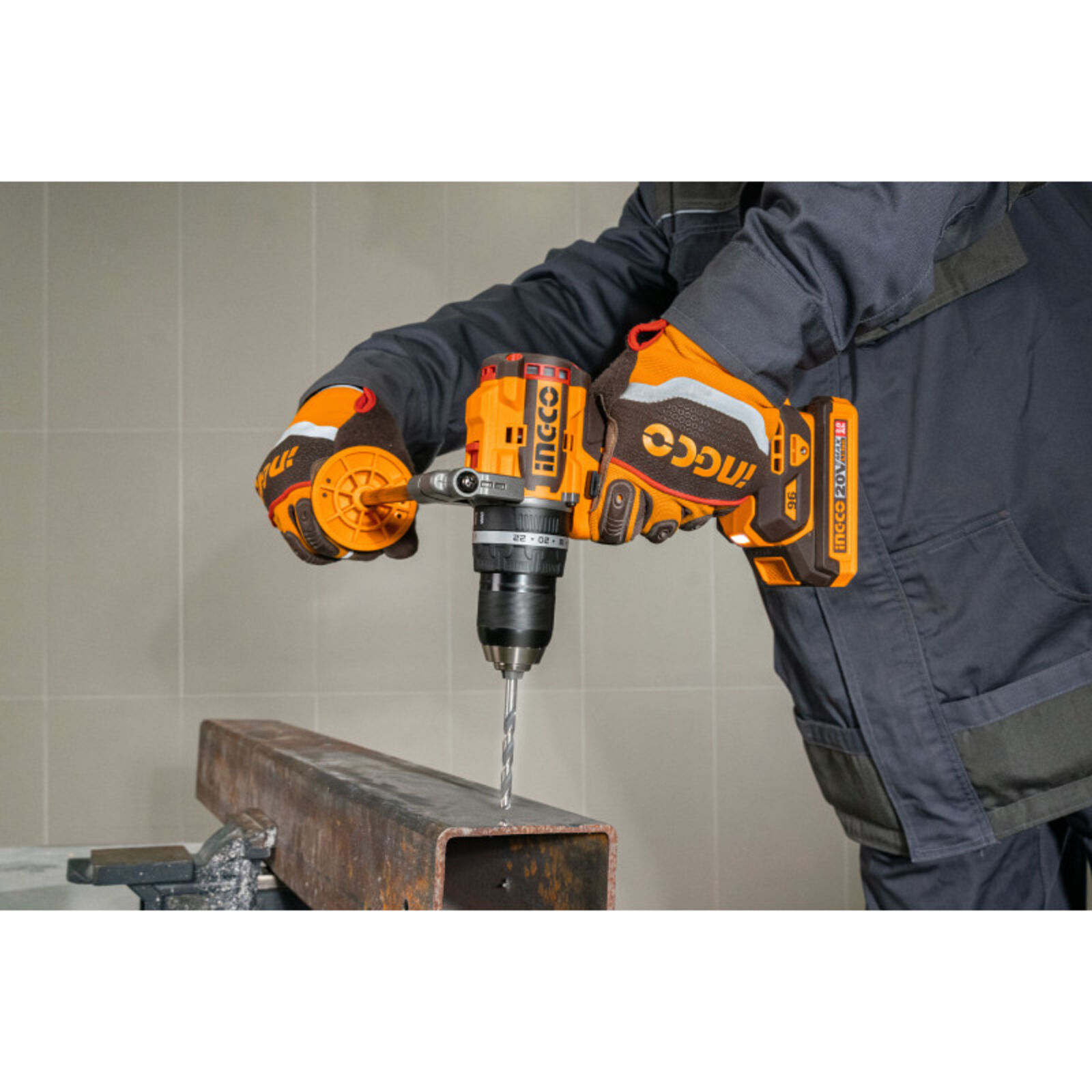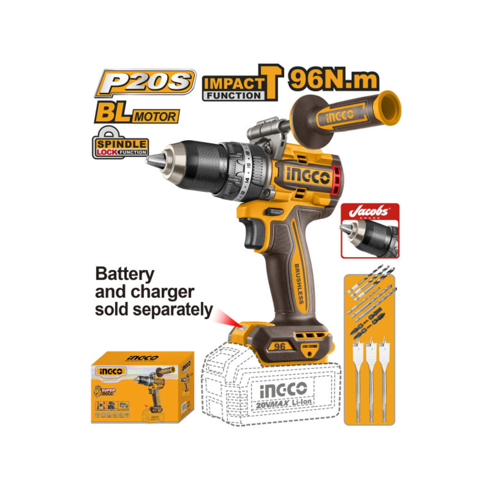 INGCO akkus ütvefúró-csavarozó 96 Nm, szénkefe nélküliAz INGCO 96 Nm nyomatékú akkus ütvefúró-csavarozó nagy teljesítményű, sokoldalú szerszám fúrási és csavarozási feladatokhoz. A szénkefe nélküli motor nagyobb hatásfokot, hosszabb élettartamot és alacsonyabb karbantartási igényt biztosít.A kétfokozatú mechanikus sebességváltó lehetővé teszi a fordulatszám és a nyomaték optimális beállítását különböző anyagokhoz. A 96 Nm maximális nyomaték erőteljes csavarozást és nagy átmérőjű fúrásokat is lehetővé tesz. Az ütvefúró funkció akár 31 500 ütés/perc értékkel hatékony fúrást biztosít falazatban.A masszív, 13 mm-es Jacobs fém tokmány stabil szerszámbefogást nyújt, míg az oldalfogantyú nagyobb kontrollt biztosít nagy terhelésű munkák során. Főbb előnyökSzénkefe nélküli motor a hosszabb élettartamért96 Nm maximális nyomaték nagy terhelésű feladatokhozÜtvefúró funkció falazathozKétfokozatú mechanikus sebességváltó13 mm-es Jacobs fém tokmányBeépített LED munkalámpaLED akkumulátor töltöttségjelzőOldalfogantyú a stabilabb fogásért Technikai adatokMotorszénkefe nélküliFeszültség20 VÜresjárati fordulatszám0–550 / 0–2100 ford/percMax. ütésszám31 500 ütés/percMax. nyomaték96 NmTokmányJacobs fém tokmányTokmánybefogás13 mmNyomatékfokozatok22+1+1Sebességváltómechanikus, 2 fokozatOrsórögzítésigenBeépített LED munkalámpaigenLED akkumulátor töltöttségjelzőigen Tartozékok: 3 db lapos fafúró (16, 19, 22 mm)3 db kőzetfúró (5, 6, 8 mm)3 db HSS csigafúró (4, 5, 6 mm)2 db 65 mm impact bithegy (PH2+PH2, PH2+SL6)1 db oldalfogantyúAkkumulátor és töltő külön kaphatóCsomagolás: színes dobozban