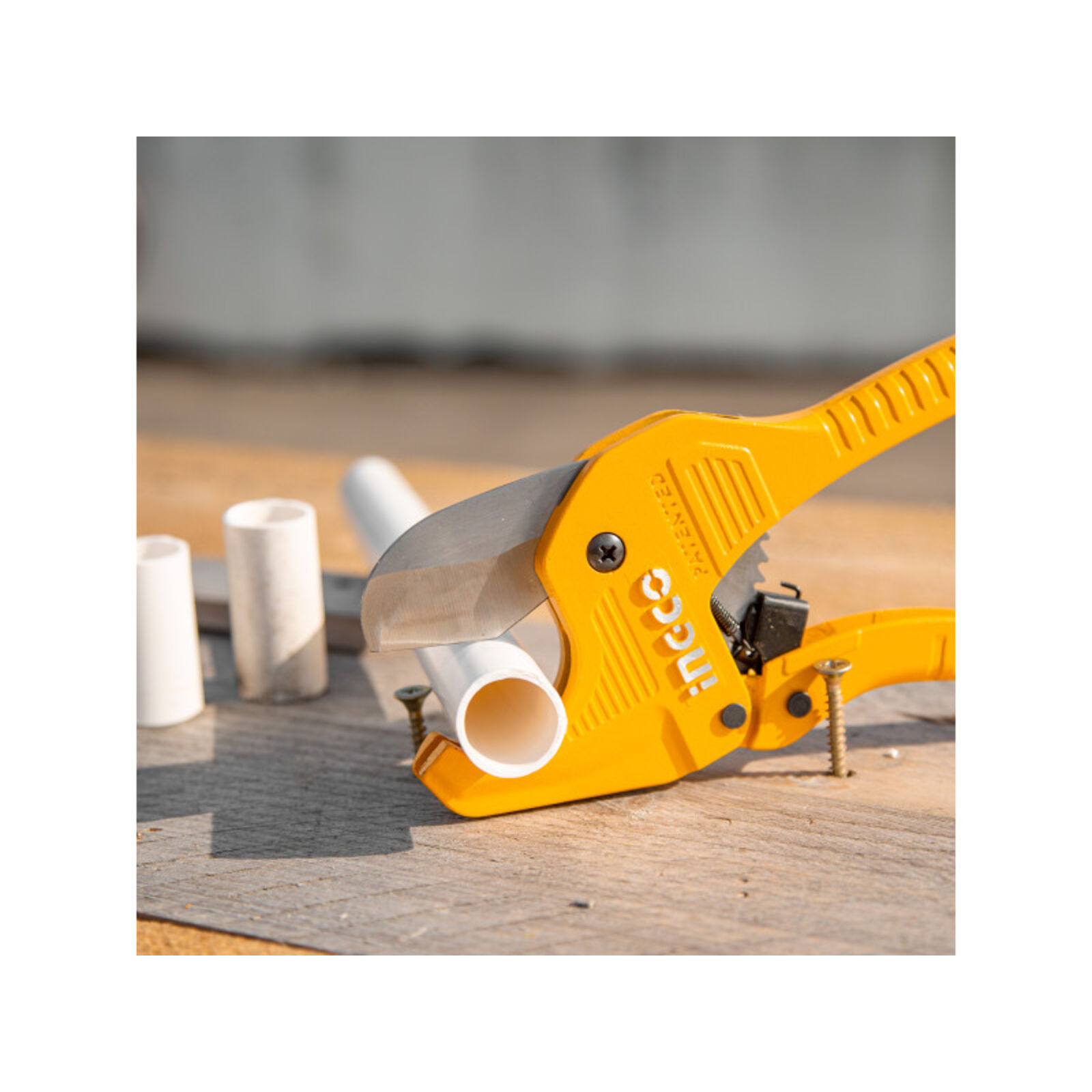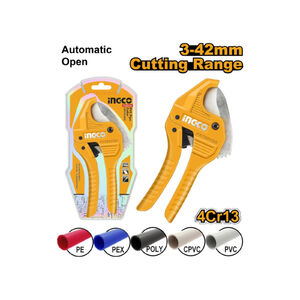 Műanyag csövek vágása, csövek javítása és telepítéseAlumínium ötvözetből készült fogantyú, kényelmes fogás. A penge Teflon bevonatú, ami élesebbé és tartósabbá teszi. Farokzár a könnyű tárolás érdekében.Hossz: 203 mmAnyaga: 4Cr13Vágó átmérő: 3 - 42 mmAutomata nyitás funkcióÚj, egyedi markolat Szállítási terjedelem: 1 db PVC csővágó olló, Bliszterben