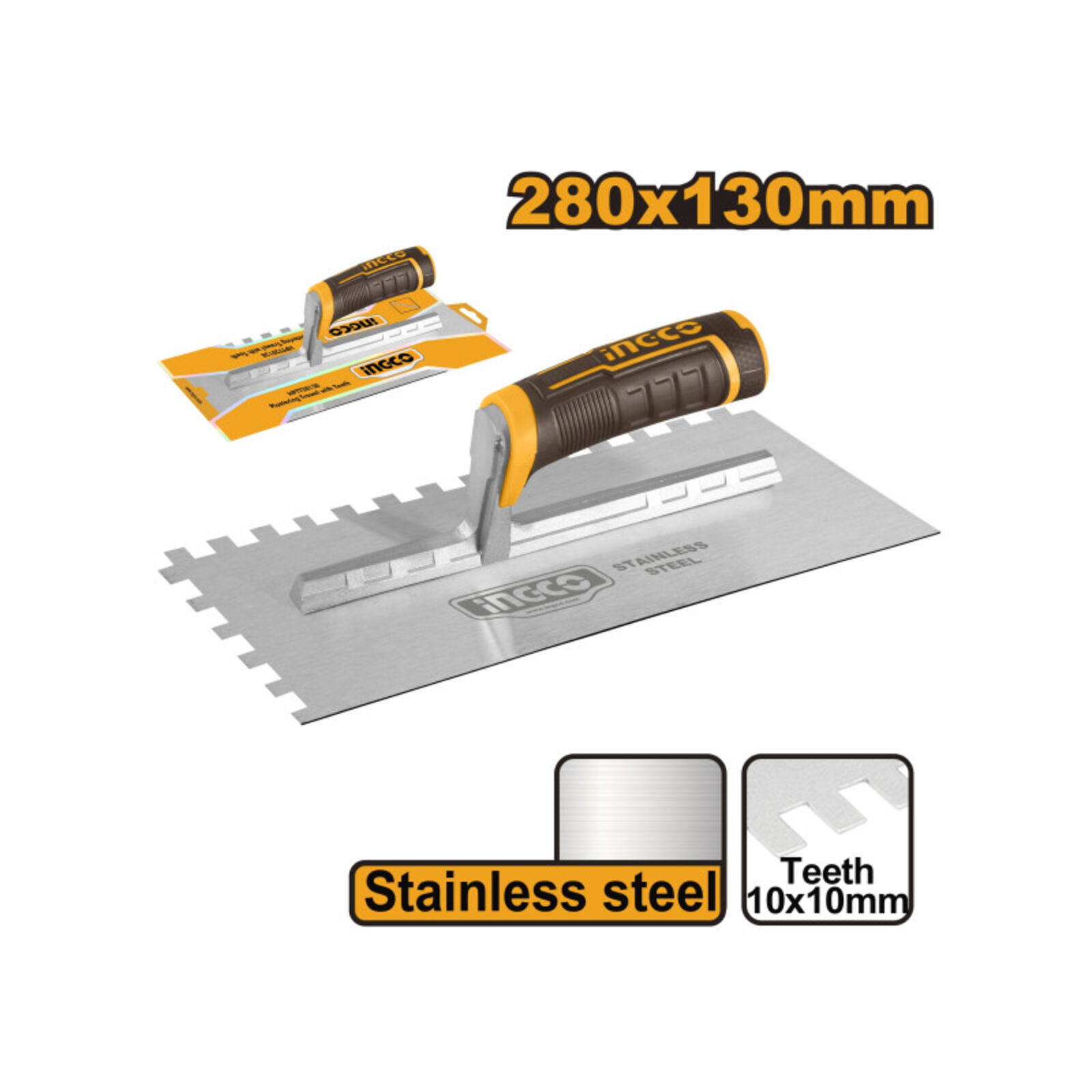 INGCO Fogazott glettvas 130 x 280 mm inox 10 x 10 mm lágy fogantyús