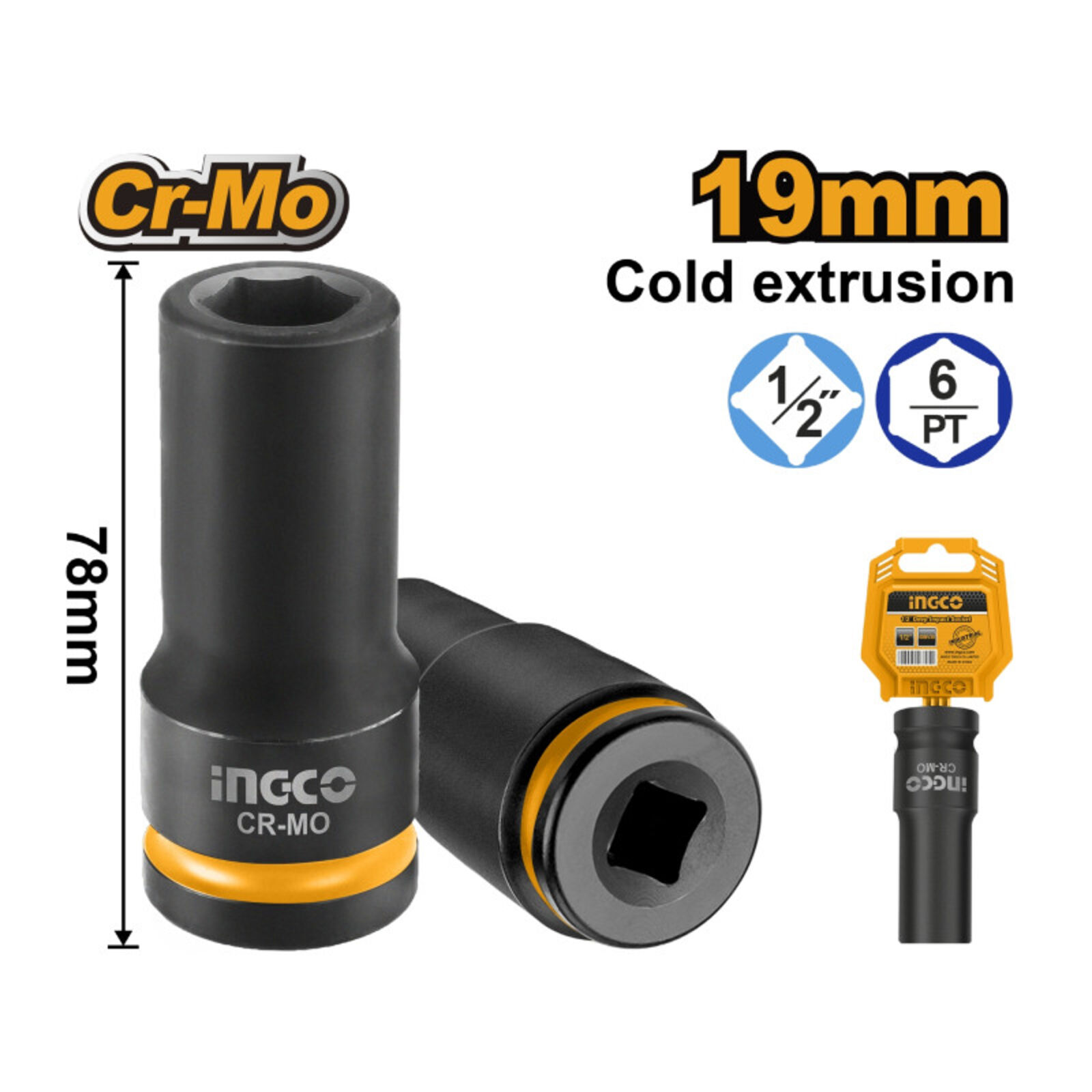 INGCO Hosszú gépi dugókulcs 1/2" 19 mm CrMo