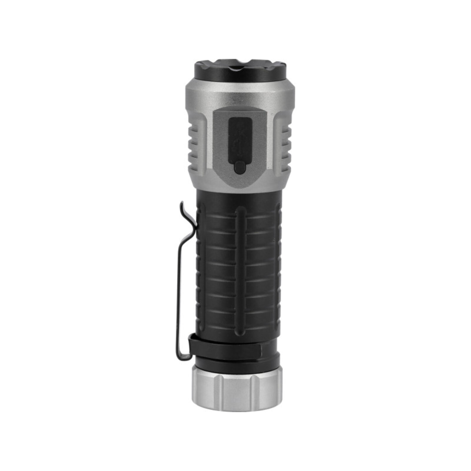 Egy kompakt zseblámpa hét móddal, hogy a világítás igazodjon a körülményekhez és tevékenységekhez. A 20 W-os LED-ek akár 2000 lm fényt bocsátanak ki, akár 12 órán keresztül, és a hatótávolságuk akár 145 m. Fényforrás: 5 POWER LED összesen 20 W teljesítménnyel 7 fény mód: 2000 lm (turbó), 1200 lm (magas), 600 lm (közepes), 250 lm (alacsony), 100 lm (ultra alacsony), villogó fény és SOS fény működési tartomány: 145 m (turbó), 115 m (magas), 95 m (közepes), 65 m (alacsony), 45 m (ultra alacsony) élettartam: 20000 óra Energiaforrás: Akkumulátor: Li-Po 3.7 V 2000 mAh (18650 típusú) működési idő: 30 s (turbó), 2 h (magas), 3 h (közepes), 7 h (alacsony), 12 h (ultra alacsony) töltési idő: 3 h Akkumulátor töltöttségi jelző (zöld/piros fény) kábel: USB-C Építés és jellemzők: vízálló: IPX4 fény színe: 6000-7000K CRI: 70 be/ki kapcsoló - bekapcsolja a lámpát, módokat vált, jelzi az akkumulátor szintjét. A gomb hosszan tartása aktiválja a pulzáló és az SOS módokat, a kétszeri megnyomás aktiválja a rendkívül erős fényt a turbó módban (2000 lm), ami automatikusan magas módba vált (1200 lm) 30 másodperc után, energiát takarítva meg anyag: alumínium mágnes az alján csipesz a ruházathoz való rögzítéshez súly: 105 g (akkumulátorral együtt) méretek: 108 × 34 × 29 mm