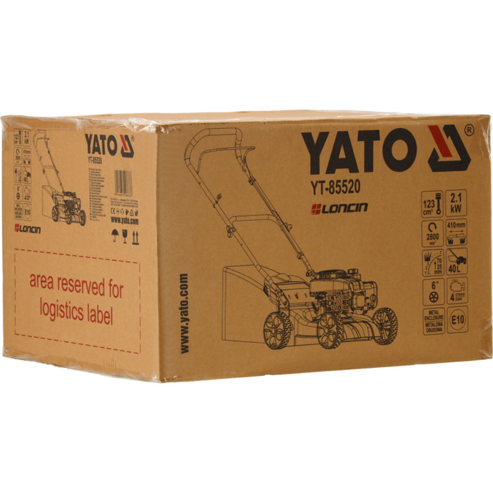 A benzinmotoros fűnyíró egy 123 cm3 LONCIN motorral van felszerelve a nagy teljesítmény és hatékonyság érdekében. A 41 cm-es munkaszélesség és a robusztus kialakítás megkönnyíti a fűnyírást a keskenyebb, egyenetlen és kihívást jelentő területeken, mint például lejtőkön, ösvényeken és virágágyások mellett vagy növénytelepítések mellett. LONCIN LC1P65FE-3 motor, 2.1 kW típus: belsőégésű motor, négyütemű, felül szelepelt kapacitás: 123 cm3 Max. nyomaték: 2800 ford/perc indító: kézi gyertyatípus: F7RTC üzemanyag típusa: ólommentes benzin E10 olajtípus: SAE 15W-40 üzemanyagtartály kapacitás: 0.9 liter olajteknő kapacitás: 0.5 liter Nyírási szélesség: 41 cm vastag 7 fokozatú vágásmagasság-állítás 25-75 mm között funkciók: hátsó kieresztés, dobás a kosárba rácsozott fűgyűjtő 40 literes kapacitással fém ház ergonomikus fogantyú habosított bevonattal kerékátmérő: 6" súly: 19.7kg zajkibocsátás: 96dB