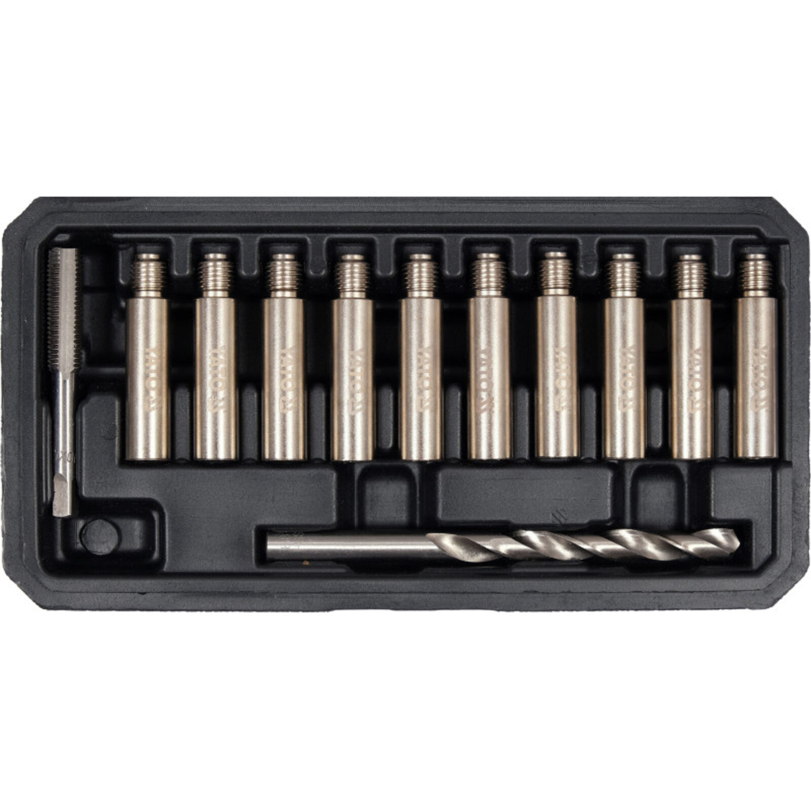 A féknyereg javító készlet profi eszköz tönkrement menetek javításához egy féknyeregben. A csomag tartalmaz egy fúrót és dedikált menetfúrót - és 10 nagyobb méretű vezetőt féknyergekhez. A javítás a sérült elem felújítását és újramenetelését jelenti - és egy új - nagyobb méretű vezetőt helyezünk fel. Mindez egy praktikus csomagolásban. anyag: HSS alkalmazás: féknyereg vezetők javításához menet mérete: M10x1.25 mm autómárkák: V.A.G. autók, Ford, Opel csomag tartalma: fúrószár (O8.8 mm), M10x1.25 mm menetfúró, 10x nagyobb méretű vezető (M10x1.25 mm menet, O12 mm, L=42 mm)