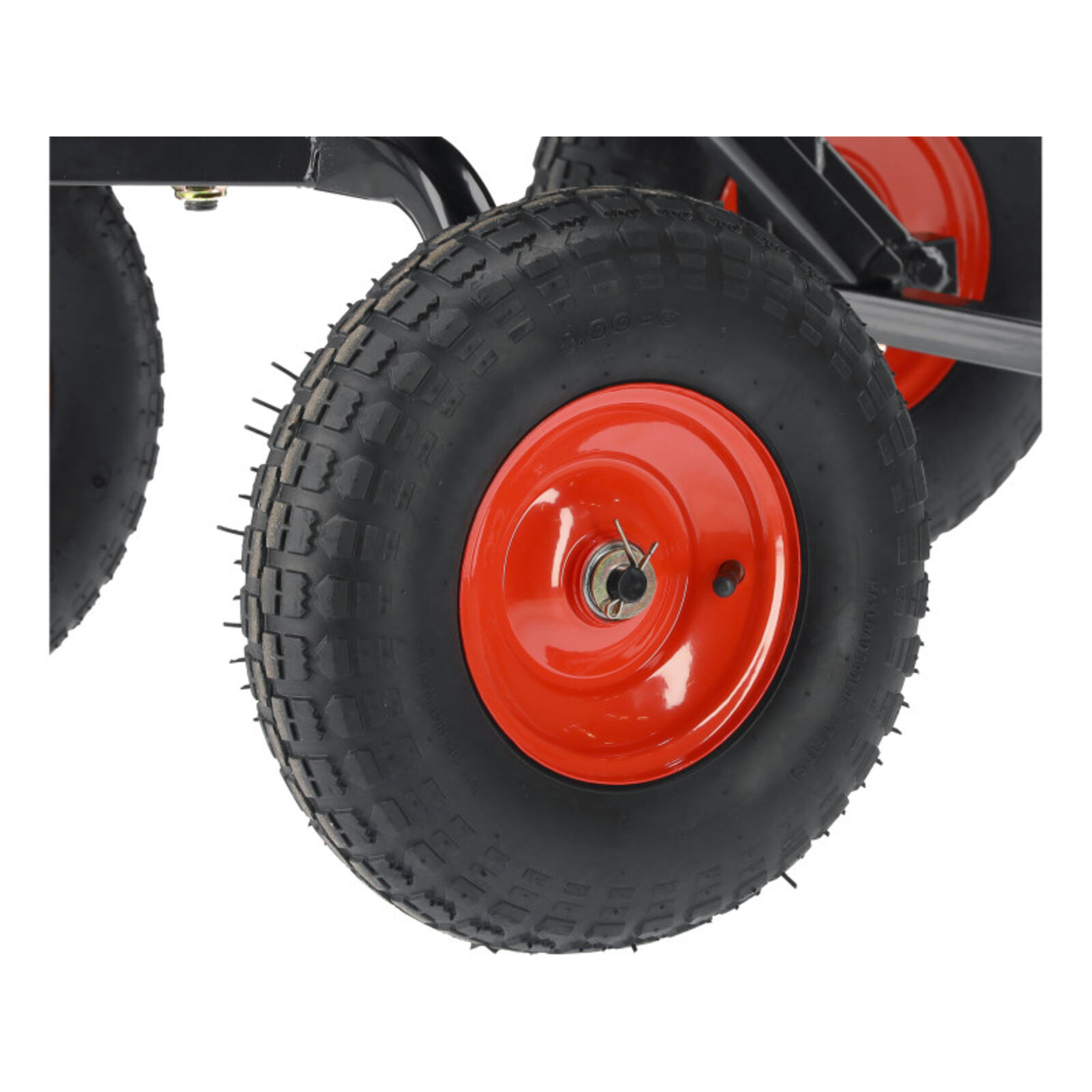Univerzális XXL méretű kocsi, mely intenzív házi, kerti és egyéb munkákhoz lett tervezve. A billenő funkció lehetővé teszi az olyan anyagok, mint a föld, homok, fa vagy kerti hulladék egyszerű lerakását, csökkentve a felhasználó erőfeszítéseit. A nagy, felfújható kerekek 13"-os futófelülettel rendelkeznek, amelyek kivételes stabilitást és könnyű mozgást biztosítanak egyenetlen terepen, és a speciális kialakítás lehetővé teszi a kocsi traktorhoz csatlakoztatását mint egy utánfutó. A megerősített keret és a nagy teherbírású doboz lehetővé teszi akár 550 kg súlyú terhek szállítását is, időt és energiát megtakarítva a felhasználó számára. A kocsi tökéletes a szakemberek számára, és azok számára, akik megbízható eszközöket igényelnek a napi munkavégzéshez a kertben, a farmon vagy a kertészetben. A billentő funkció gyors és könnyű anyaglerakást biztosít, növelve a munkahatékonyságot lehetőség utánfutóként való csatlakoztatásra és munkavégzésre kerti gépekkel megerősített konstrukció, erős kerettel és kiváló minőségű anyagokkal garantálja a magas tartósságot és a hosszú élettartamot 550 kg-ig terjedő teherbírás lehetővé teszi nagyon nehéz terhek szállítását: kövek, fa vagy homok nagy, felfújható kerekek 13" átmérőjű futófelülettel garantálják a kiváló tapadást és stabilitást a különböző felületeken tartós raktárdoboz, ellenáll a károsodásnak a torziós első tengely megkönnyíti a manőverezést és a precíz mozgást szűk helyeken ergonomikus fogantyú kényelmes vezetést biztosít a kocsival Műszaki adatok: méretek: 1160 x 810 x 1030 mm rakodódoboz méretei: 1016 x 653 x 273 mm teherbírás: 550 kg felfújható kerekek 330 mm átmérővel és 100 mm szélességgel futófelülettel (13" x 4-6) doboz anyaga: tartós műanyag keret anyaga: megerősített porfestett acélprofilok