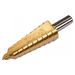 Yato YT-44744 fokozatos fúró. Kiváló minőségű rozsdamentes acélban, szerkezeti és hidegen hengerelt acélban, színes fémekben, acéllemezekben, műanyagban való fúráshoz tervezték. • Magas sebességű HSS 4241 acélból készült, titán-nitrid bevonattal, amely megnöveli a fúrók élettartamát • A fúrt lyuk szélei tiszták és élesek maradnak • automatikus középpontozás kerek és csúszós felületeken • Gyors hőelvezetés kemény anyagokban fúrás közben. Három lapos felületével lehetővé teszi a maximális nyomatékátvitelt. Használati figyelmeztetések: Figyelem! Mindig használjon személyes védőfelszerelést a munka során.