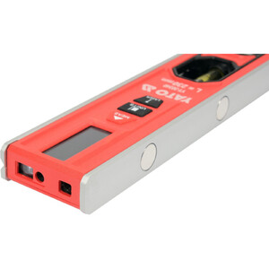 Elektronikus torpedószint 230 mm-es lézerrel a távolságméréshez és a vízszintes vagy függőleges vonal meghatározásához. A távolságmérő álló vagy dinamikus módban (változó távolság mérés közben) működhet. Mérhető az előlapon vagy a hátulján. Az eredményeket az LCD képernyőn jelenítjük meg. A ház felső lapjába egy horony (prizma) van vágva. A szintezőben két üvegpalack van, amelyeket egymástól függetlenül meg lehet világítani. Az alapban 3 erős mágnes van beépítve. Az alkatrész alumínium szekcióból, a ház ABS-ből készült. lézer pontosság: ± 3 mm / 0,5-20 m lézer: 2. osztály, piros szín automatikus kikapcsolás 3 perc után működési hőmérséklet: 10-től 40 °C-ig tápellátás: lítium akkumulátorok 300 mAh 3,7 V méretek: 230x20x47 mm Használati figyelmeztetések: Vigyázat: lézersugárzás. Ne nézzen bele a fénysugárba. 2. osztályú lézereszköz.