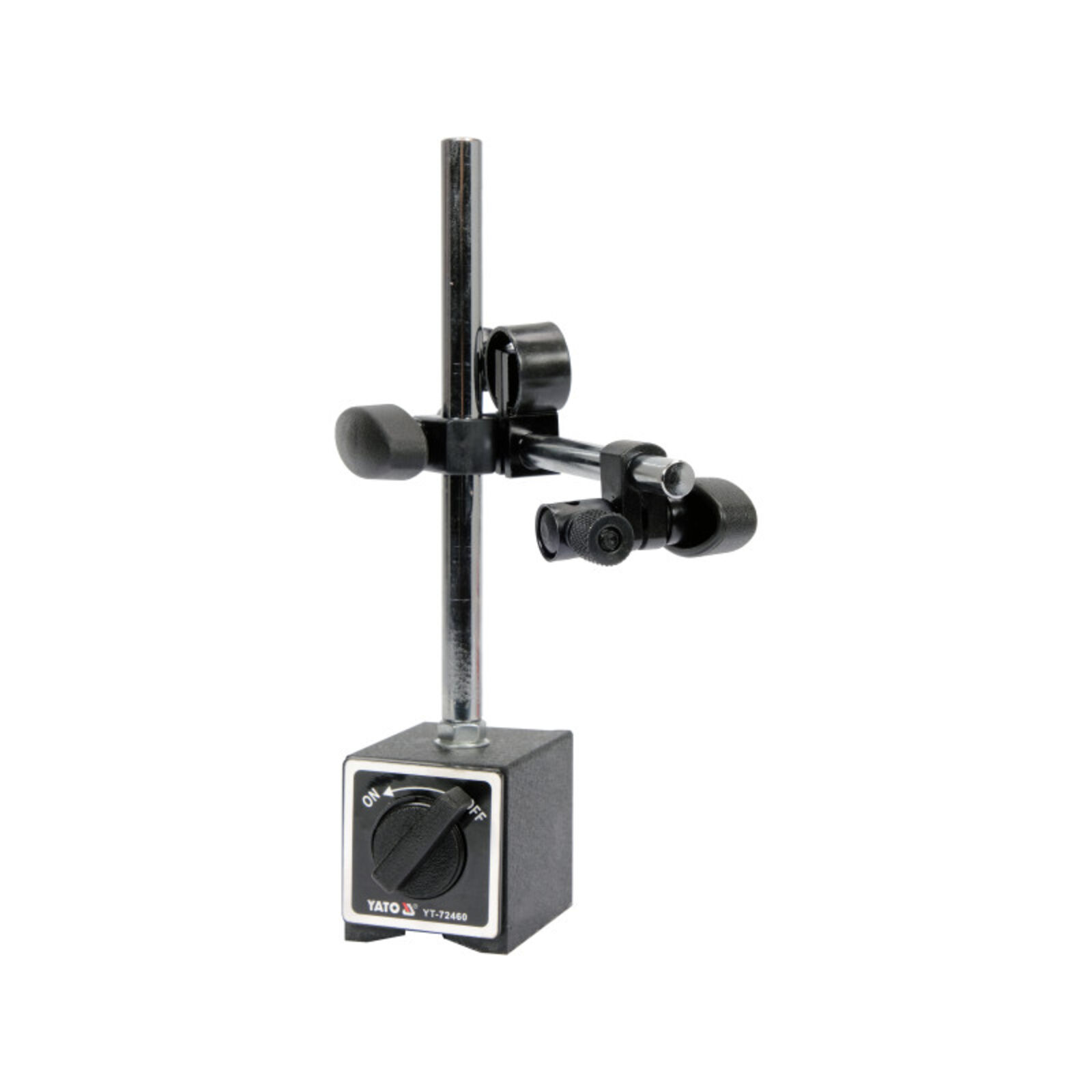 Professzionális mágneses állvány YT-72460, YT-72450 és YT-72453 típusú óraszenzorokhoz. Rugós csuklóval rendelkezik a szenzor pontos pozícionálásához a mérési felületen. Középső és felső csuklóját egyszerre rögzíti központilag egy gomb segítségével. Mágneses talppal, melynek alsó részén prizmatikus horony található. Nagy húzóerő biztosítja a stabil és biztonságos kapcsolatot a fém alkatrészekkel - az elem leválasztása egy speciális gomb segítségével valósul meg.
