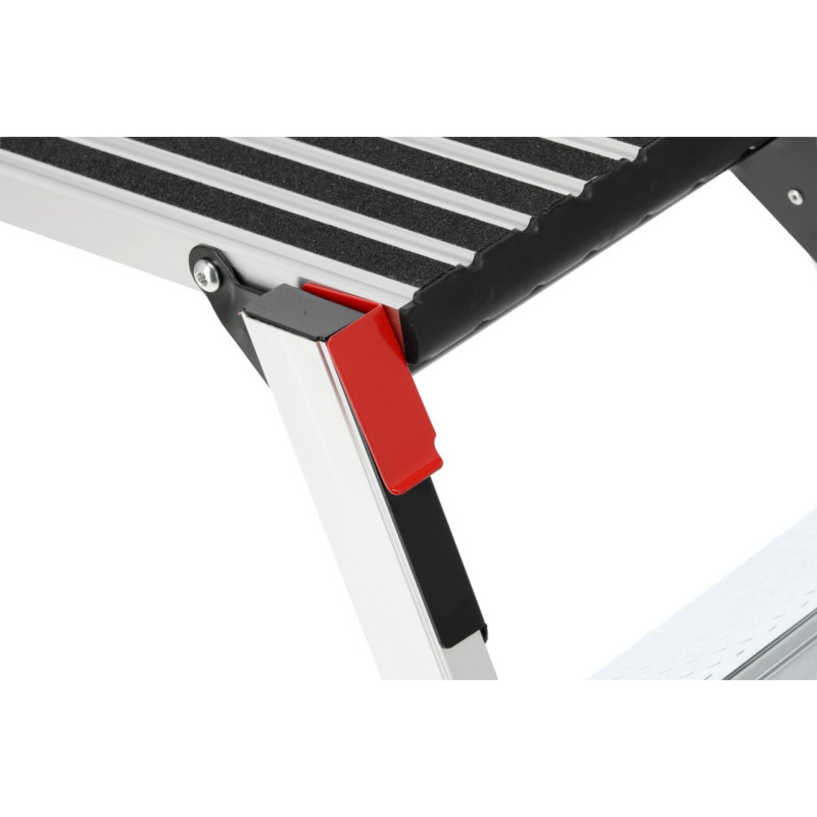 Összecsukható munkaállvány alumínium profilokból. A biztonságos használat érdekében a platformot csúszásmentes lécek borítják, a lépcsőfokok pedig dombornyoltak. A kényelmes kihajtást nagy méretű zárókapcsok biztosítják. lap méretei: 906 x 305 mm magasság: 490 mm maximális terhelhetőség: 150 kg