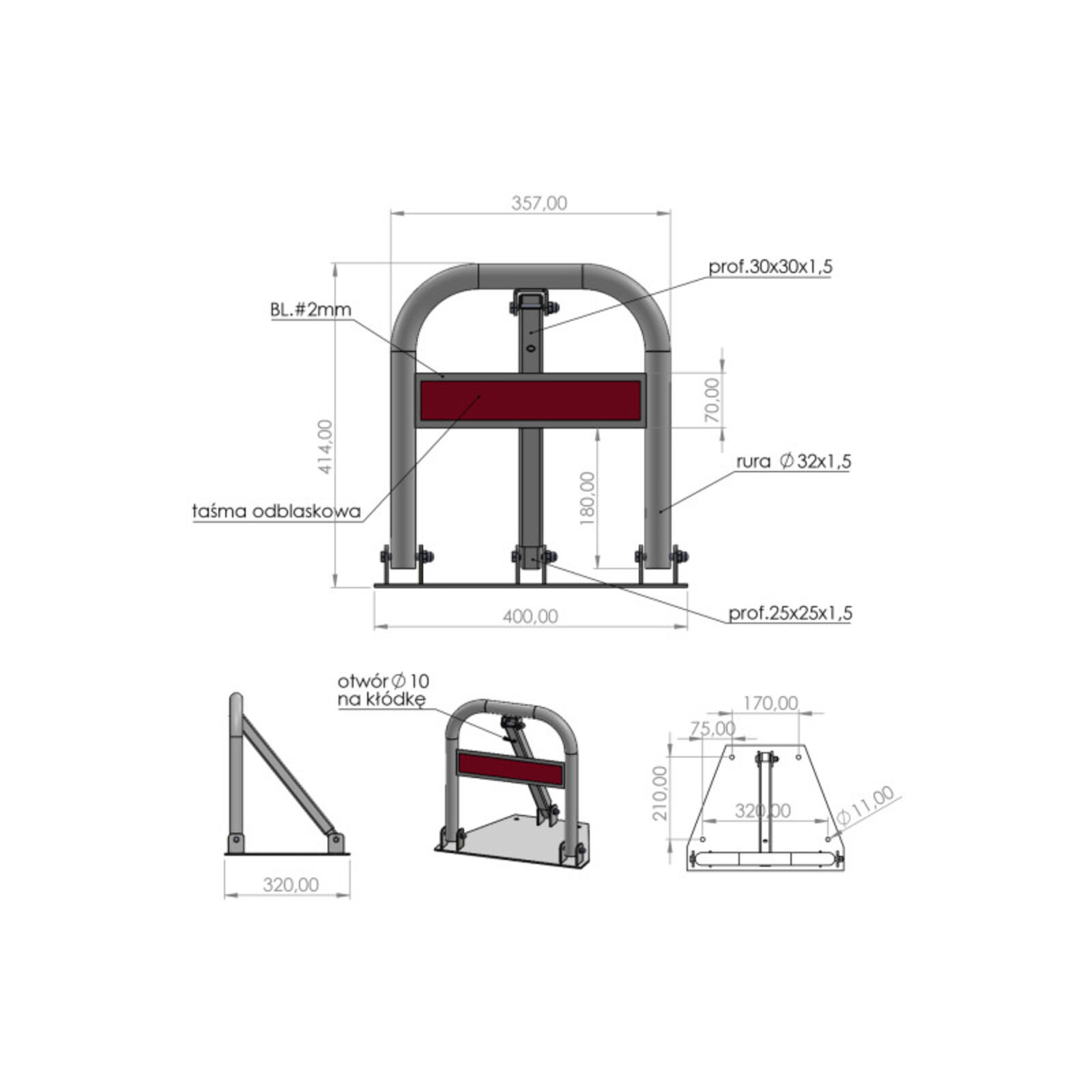 "Patkó" összecsukható parkolózár az engedély nélküli behajtás vagy parkolás hatékony megakadályozására. Kényelmet és biztonságot nyújt a kijelölt területekhez való hozzáférés kezelésében. Lehetővé teszi, hogy ideiglenesen blokkolja a parkolóhelyeket vagy a behajtást, mint például magántulajdonban, gyalogos és közúti útvonalakon, zöld területeken, árvízi töltéseken, sétányokon. anyaga: porfestékkel bevont acél szerelési távolság: 17/31 x 22 cm alap méretei: 20/40 x 32 cm szélesség: 32 cm magasság: 46 cm a csőfal vastagsága: 1,5 mm az alaplap vastagsága: 2 mm cső átmérője: 22 mm lyukak átmérője az alapon: 11 mm a lakat hurok maximális átmérője: 10 mm súlya: 4,5 kg 4 darab egy kollektív csomagban